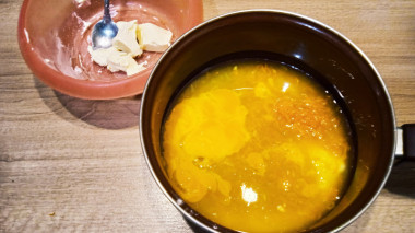 В сотейнике смешайте сырые яичные желтки, сахар, апельсиновую цедру и апельсиновый сок.