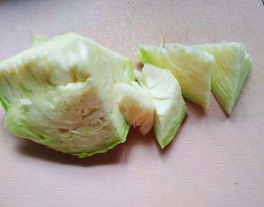 Лучше брать капусту поздних сортов, белого цвета, сочную. Снимите с кочана верхние листья. Нарежьте капусту крупными квадратами.