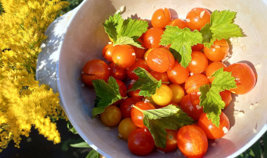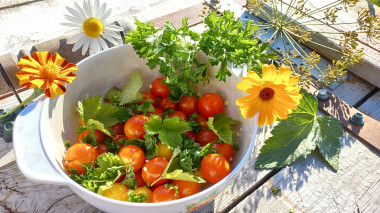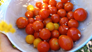 Взяла помидорки черри и аккуратно, надрезала ножом. Измельчила чеснок, добавила зелень и для аромата, решила добавить листья смородины. Затем, помидоры поместила в пакет, добавила соль и немного сахара. Завязанный пакет, аккуратно встряхнула для равномерного распределения ингредиентов и на сутки, поместила в холодильник.