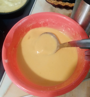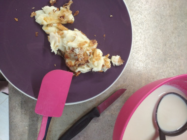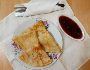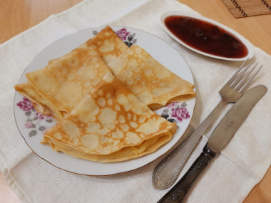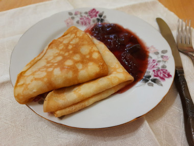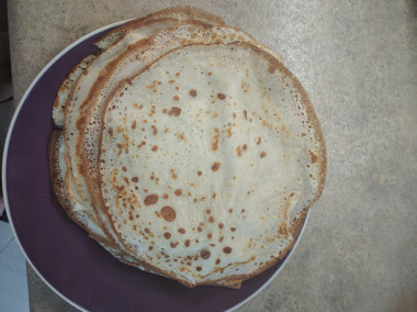Количество продуктов хорошо подсчитано. Хотя мне кажется, что я слегка больше добавила муки. Получилось 10 толстых блинчиков. Заварное тесто для блинов на молоке готовились легко и надо быть осторожнее, т к легко пригорает