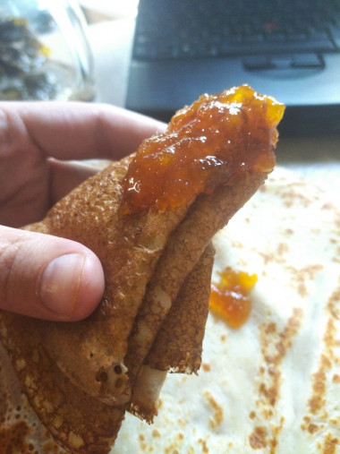 П.С. Конечно, первый блин был комом. И переворачивал я лопаткой, а не лихо подбрасывая. Готовил под абрикосовый джем, рецепт есть на этой площадке. Навеяно завтраками из макдака.