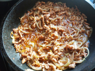 6. Лук обжариваем на растительном масле до легкого румянца, затем выкладываем к нему порезанное филе, продолжаем жарить 2-3 минуты.