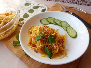 Решила сегодня приготовить камдичу. Для рецепта взяла свинину. Мясо было слегка подморожено, так его проще нарезать тонкой соломкой. Картофель измельчила на корейской тёрке. Промыла холодной водой и опустила в кипящую воду. Главное- не передержать картофельную соломку в кипятке. У меня картофель очень разваристый, поэтому даже не доводила воду с картофельной соломкой до повторного закипания. В остальном следовала рецепту автора. Камдича получилась отменная. Аромат специй- на всю кухню!!! Сытно, вкусно! Очень любим корейские салаты. Спасибо, danela!