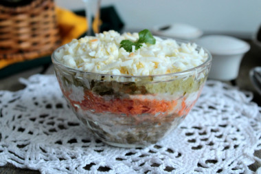 Простой, вкусный и сытный салат для праздничного стола! Готовила на день рождения сына, решила уложить слоями. Такой салат с куриной печенью и солеными огурцами и морковью по составу не только очень вкусный, но сытный, полезный и питательный. В него входит богатая белком куриная печень. Маринованные огурцы делают вкус салата пикантным, морковь, куриные яйца – нежным, а сыр придает приятный привкус и аромат. Салат был гвоздём программы, уплетали за обе щеки. Спасибо за рецептик, утащила в закладки