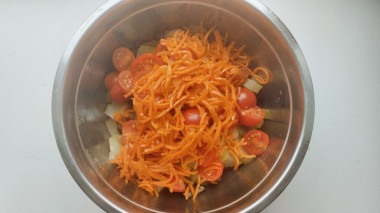 Морковь по-корейски выложите из рассола, при желании можете порезать на более короткие полоски. Добавьте морковь в салатник.