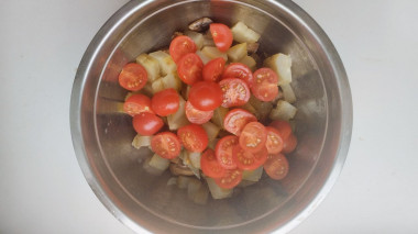 Свежую зелень петрушки промойте под проточной холодной водой и встряхните от лишней влаги. Нарежьте петрушку и добавьте в салат. Помидоры черри промойте, обсушите и разрежьте на две части. Добавьте помидоры в салат.