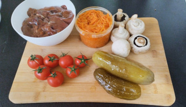 Как сделать салат с куриной печенью и солеными огурцами и морковью? Подготовьте указанные ингредиенты. Куриную печень выбирайте свежую, ранее не замороженную. Морковь по-корейски можно взять из магазина, а можно приготовить дома самостоятельно. Соленые огурцы выбирайте крепкие, хрустящие, с приятным вкусом. Шампиньоны будут обжариваться, поэтому можно взять и замороженные. Из зелени я беру петрушку, но можно дополнить листьями салата, рукколой.