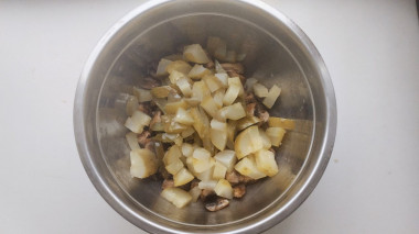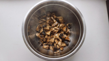 Обжаренные остывшие шампиньоны с луком добавьте в салат.