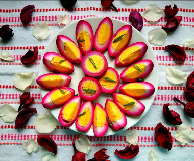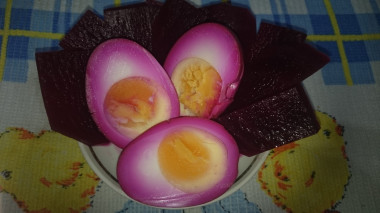 Вообще, эта закуска у меня получилась случайно) Я варила яйца на завтрак и искала на сайте рецепты. И тут я увидела эту красоту Маринованные яйца куриные! В итоге завтрак был другим, а яйца замариновала. У меня было пять штук в наличии, как раз на пробу достаточно. Свёкла попалась хорошая, яркая, она отлично окрасила белок. Заменила здесь только итальянские травы на сухой розмарин, остальное по рецепту. Яйца настаивались сутки как и положено. После извлечения их из банки сполоснула кипяченой водой, чтобы смыть травки и обсушила бумажным полотенцем. Разрезать яйца было очень волнительно, но все ожидания оправдались) Какая же красота получилась! Да еще и яйца домашние, с ярко желтым желтком. Спасибо за рекомендацию по варки яиц, желток не посинел, остался красивым. Разрез шикарный, яркий! Можно запросто использовать эту идею для праздничного стола, украсить бутерброды, салат или канапе. На вкус мне тоже понравилось. Уксуса и специй в меру. Яйца слегка кисленькие, чуть соленые и сладковатые. Это необычно и очень вкусно. При этом белок стал более твердым и упругим, чем обычно. А желток остался нежным, кремообразным. Вкусно было макать дольки в майонез и сметану. Спасибо за красивую идею!