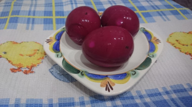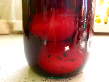 Помойте содой 1,5 литровую банку. Желательно простерилизовать ее, подержав над паром. Или поставьте ее в холодную духовку и прогрейте в течение 10 минут при температуре 170 градусов. Крышку также помойте содой и прокипятите 5-10 минут. Очищенные яйца переложите в сухую подготовленную банку. Залейте горячим свекольным маринадом. Прикройте крышкой и дождитесь остывания. Когда банка остынет, плотно закройте ее крышкой и поставьте в холодильник на 24 часа.