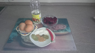 Отварите нарезанную свеклу до мягкости (варите около 10-15 минут после закипания) с добавлением 2-3 столовых ложек уксуса. Тогда ее цвет станет более насыщенным и ярким.
