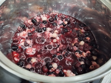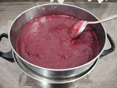 Кастрюлю снимите с огня. Клюкву измельчите с помощью погружного блендера.