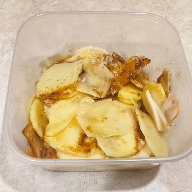 Выложила картофель в контейнер. Чеснок мелко порезала и обжарила на масле. К картофелю добавила специи, полила маслом с чесноком, хорошенько перемешала. Выложила картофель на противень и запекла в течении 30 минут при 200°.