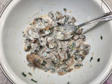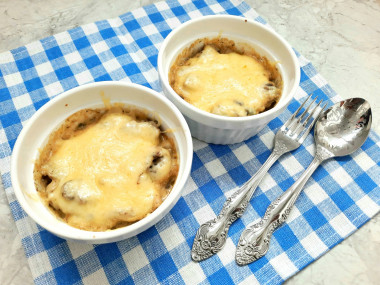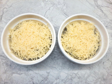 В отдельную емкость переложите обжаренные грибы. Добавьте 1 столовую ложку тертого сыра. Перемешайте. Распределите грибную массу по кокотницам, не доходя до краев посуды на 2-3 см. Оставьте место для соуса и сыра.