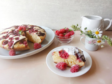 Вынимаем пирог из формы, выкладываем в тарелку, украшаем ягодами малины и посыпаем сахарной пудрой. Подаем к чаю. Он вкусен как в горячем, так и в холодном виде. Приятного аппетита!