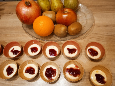 Смажьте формочки для кексов растительным маслом. С выбором формочек поможет статья по ссылке в конце рецепта. Выложите в каждую формочку примерно по 1 ст. л. теста, добавьте 0,5 ч. л. любого джема и сверху положите ещё ложку теста. Точное количество теста и джема будет зависеть от размера формочек.