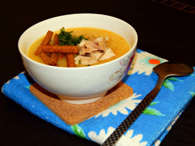 Гороховый суп пюре с копченостями готовится легко, единственное – требуется время для варки гороха. Я от себя добавила ещё картошку и при подачи посыпала сухариками. Кстати, получается суп-пюре нежный по консистенции, похож даже на крем-суп с приятным вкусом гороха и копченостей.