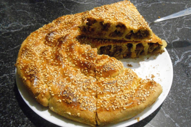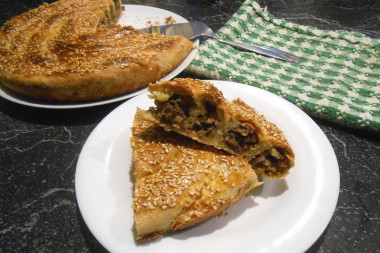 Улитка из лаваша с фаршем в духовке пирог получилась на отлично. Количество продуктов увеличила немного с помощью калькулятора и готовила в форме диаметром 25 см. Использовала свиной фарш, добавила копченую молотую паприку и молотый чёрный перец. Лук обжарила до прозрачности и добавила в фарш по совету автора. Фарш получился чуть суховат, добавила немного водички по рекомендации автора. Лаваш покупала тонкий армянский. Без проблем свернула трубочки и уложила улиткой. Готовила пирог без заливки по своим соображениям. Просто смазала взбитым яйцом и посыпала кунжутом. Запекала пирог улитку 35 минут при 180 С до румяности.