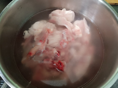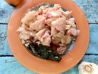 Подготовить куриное мясо: снять его с костей, нарезать небольшими кусочками, маленькие кости можно оставить, при этом трубчатые обязательно перерубить.