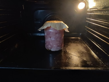 Поставить банки на противень, закрыв фольгой, в которой вилкой сделать проколы для выхода пара.