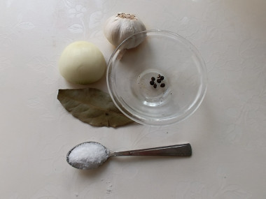 На дно банки положить пару лавровых листов, перец горошком, кольца лука и нарезанный чеснок (на 1 банку половина закладки продуктов, рецепт рассчитан на 2 пол литровые баночки).