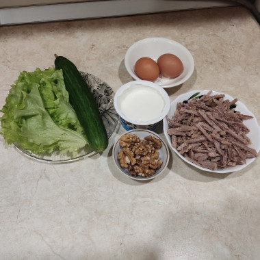 На блюдо выложила листья салата, сверху говядину, сеточку из майонеза со сметаной. Затем огурцы, яичные блинчики соломкой, сеточка из майонеза со сметаной, измельченный зелёный лук и грецкие орехи. Салат немного постоял, пропитался и можно кушать.