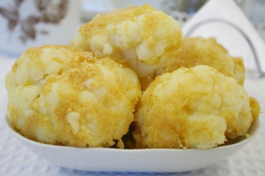 Немного остывшие соцветия капусты обмакните в яичную смесь, затем запанируйте в сухарях.