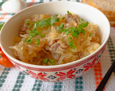 Приготовила тушёную капусту с фаршем в мультиварке. Фарш использовала смешанный. В режиме "жарка" обжарила нарезанный репчатый лук , затем к луку добавила фарш, обжарила всё вместе, помешивая минут 5-7. Затем в чашу мультиварки выложила нарезанную капусту, добавила соль, перец, паприку. У меня мультиварка - скороварка, поэтому рецепт адаптировала под особенности её работы: уменьшила количество воды до 1/3 стакана, и готовила капусту в режиме "тушение" 20 минут. Блюдо простое, сытное, вкусное! Спасибо автору за рецепт!