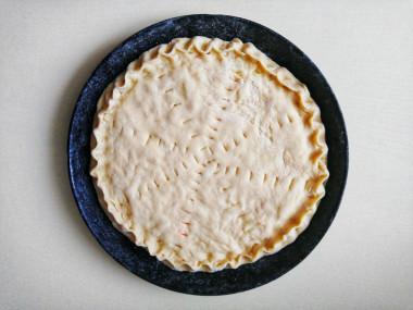 Разминаем и раскатываем вторую часть теста до тонкой лепешки, которую затем выкладываем в форму сверху начинки.