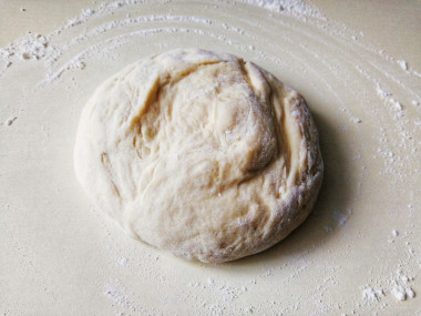 По прошествии времени выкладываем тесто на присыпанный небольшим количеством муки стол и обминаем, после чего разрезаем его на две не равные части.