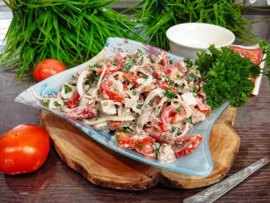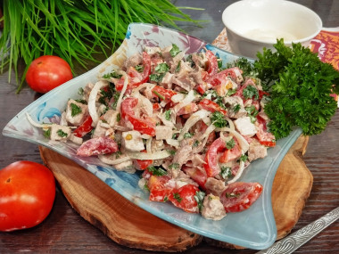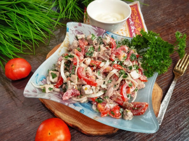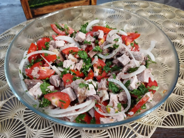 Готовый салат из свинины с луком и помидорами подавайте к столу сразу же, пока он не потерял внешний вид. Приятного аппетита!