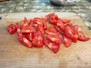 Помидоры разрежьте пополам, удалите плодоножку, сначала нарежьте на дольки, а затем на крупные кусочки.