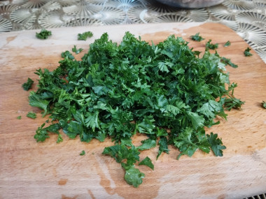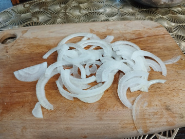 Остывшее мясо порезала небольшими кубиками. Лук порезала полукольцами. Помидоры у меня были небольшие и я их порезала также полукольцами. Вместо зелени укропа я использовала зелень петрушки, которую мелко порезала.