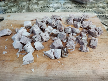 Полностью остывшую вареную свинину нарежьте крупными кубиками.