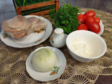 Как сделать салат с отварной свининой, луком и помидорами? Подготовьте все необходимые продукты. Свинину заранее отварите и остудите полностью. Вымойте овощи и зелень, очистите луковицу.