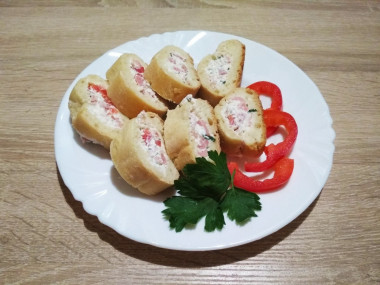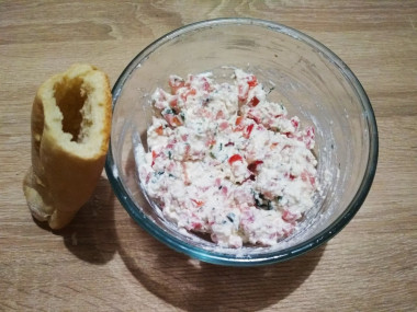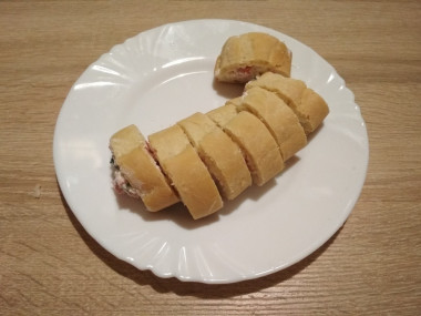 4. Наполняем багет подготовленной начинкой, упаковываем в пищевую пленку и отправляем в холодильник на 3 часа.