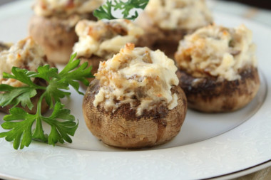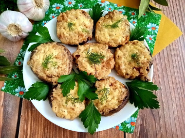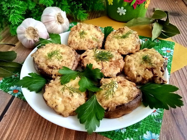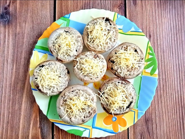 Готовой начинкой наполните шляпки грибов. Сверху посыпьте оставшимся сыром.