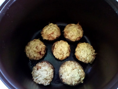 В чашу мультиварки налейте еще немного масла. Выложите фаршированные грибы. Включите мультиварку на режим "Выпечка" и готовьте грибы 40 минут. Ориентируйтесь по своей мультиварке. У меня 2 грибочка не поместилось. Я их добавила через несколько минут после начала приготовления. Грибы немного уменьшились и между ними появилось место.