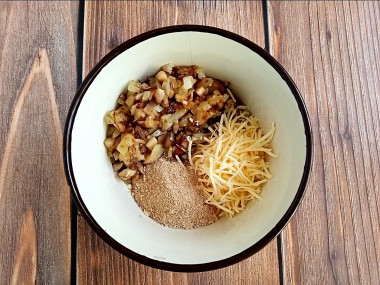 Поджаренные грибы выложите в миску и смешайте с панировочными сухарями. Немного остудите.