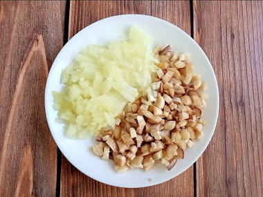 Лук очистите от шелухи и ополосните в холодной воде. Затем лук мелко нарежьте. Так же измельчите ножки от грибов.