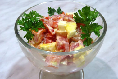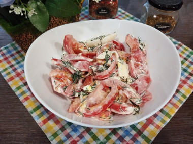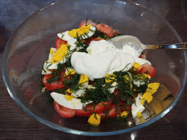 По настоящему летний салат из помидоров, яиц и чеснока, он малокалорийный, но в то же время достаточно сытный. Конечно же лучше использовать майонез домашнего приготовления, также можно заменить его йогуртом по желанию. Перед подачей можно украсить салат зеленью.