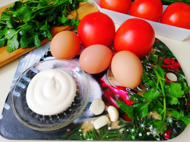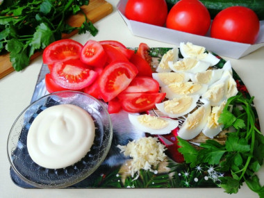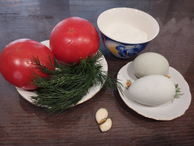 Как сделать салат из помидоров, яиц и чеснока? Подготовьте для этого необходимые ингредиенты. Количество и пропорции ингредиентов даны примерные. Можно что-то увеличить или уменьшить по своему усмотрению. Для заправки майонез можно заменить на сметану.