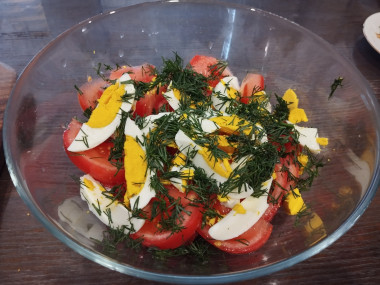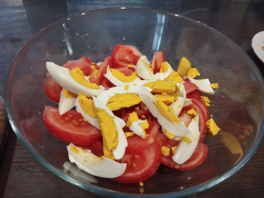 Яйца так же нарежьте ломтиками. Добавьте нарезанные яйца в чашу к помидорам.