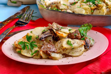 Говядину с картошкой и грибами разложите по тарелкам, украсьте свежей зеленью и подайте к столу. Приятного аппетита!