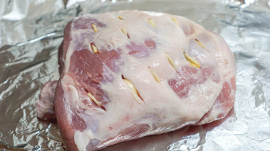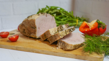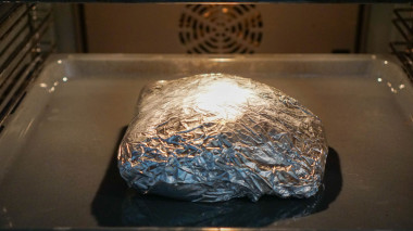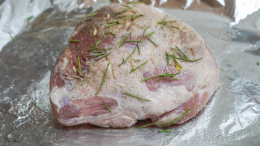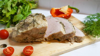 4. Завернуть в фольгу и поставить в разогретую духовку. Мясо запекается примерно 1 час при температуре 180 градусов. Остывшее мясо порезать на кусочки и подать к столу. Приятного аппетита!