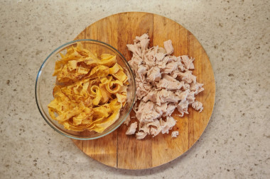 Куриное мясо достать из бульона и разобрать на кусочки.