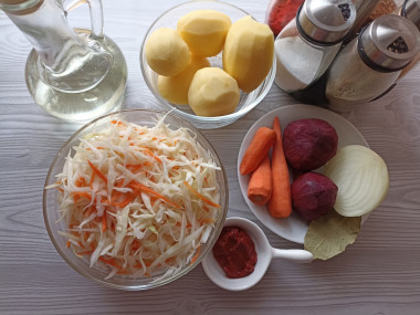 Калорийность продуктов: Картошка, Свекла, Морковь, Лавровый лист, Томатная паста, Капуста квашеная, Соль, Лук репчатый, Куриные крылышки, Подсолнечное масло