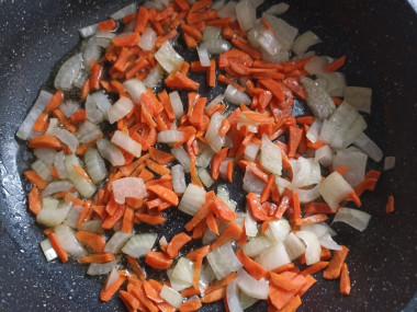 4. Приготовьте заправку: потушите лук с морковью на масле. Свеклу можно добавить сюда же и продолжить тушение, а можно потушить отдельно, добавив томатную пасту и бульон из борща.
