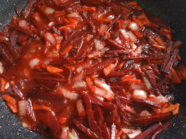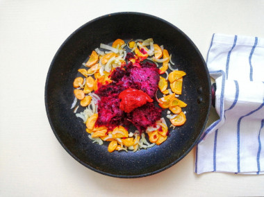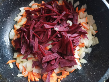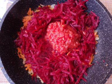 Свеклу взяла замороженную. С ней и вкус, и цвет блюда - как со свежей. И хлопот с замороженной меньше, не надо чистить и тереть на терке. Добавила свеклу к жарящимся луку и моркови вместе с  томатной пастой. А саму зажарку отправила в кастрюлю в конце готовки.