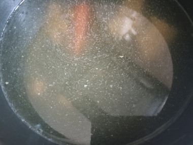 3. Куриные крылья (или другие части курицы) хорошо промойте, разрубите по суставам и, залив водой вровень с мясом, прокипятите минут 5 (для магазинной курицы). Затем слейте бульон, хорошо промойте крылья, кастрюлю, залейте чистой водой в необходимом количестве и варите как обычно бульон, добавив стебли и корешки.